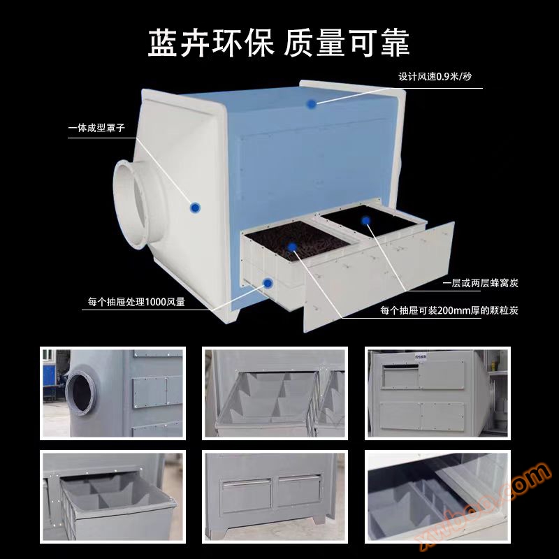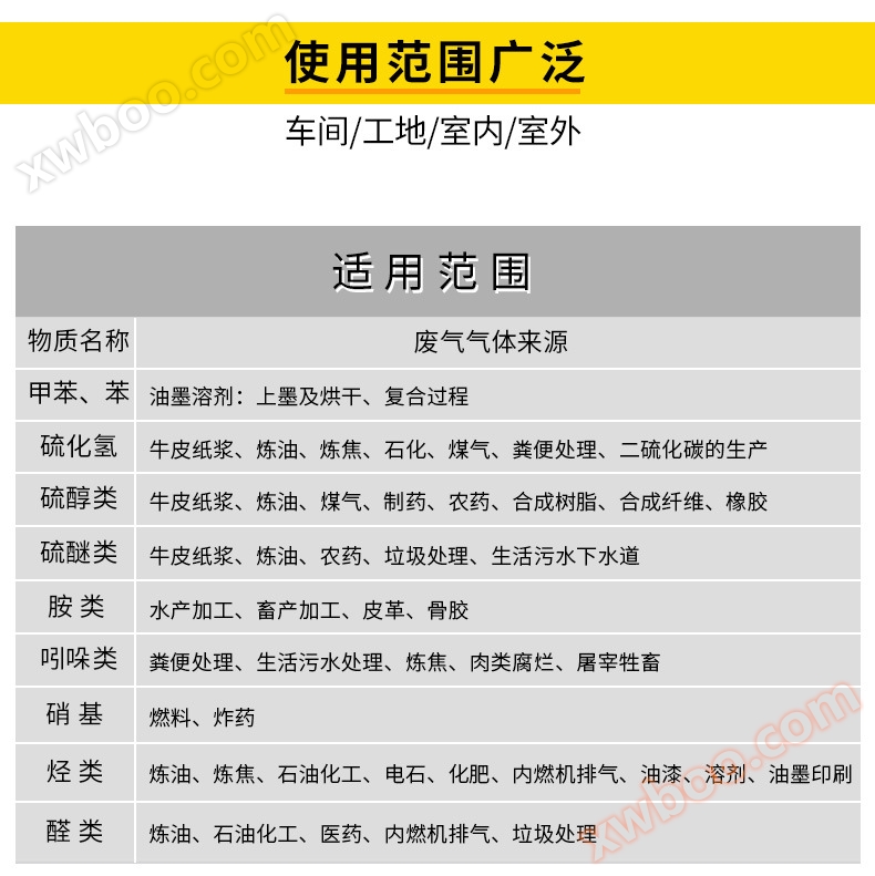 Activated carbon adsorption boxes can purify various organic and inorganic pollutants, including benzene, ketones, alcohols, ethers, alkanes, and mixed organic waste gases, acidic waste gases, and alkaline waste gases. Therefore, activated carbon adsorption boxes are widely used in industries such as pharmaceuticals, smelting, chemicals, machinery, electronics, electronics, painting, and printing, and are suitable for the treatment of low air volume and low concentration organic waste gases.