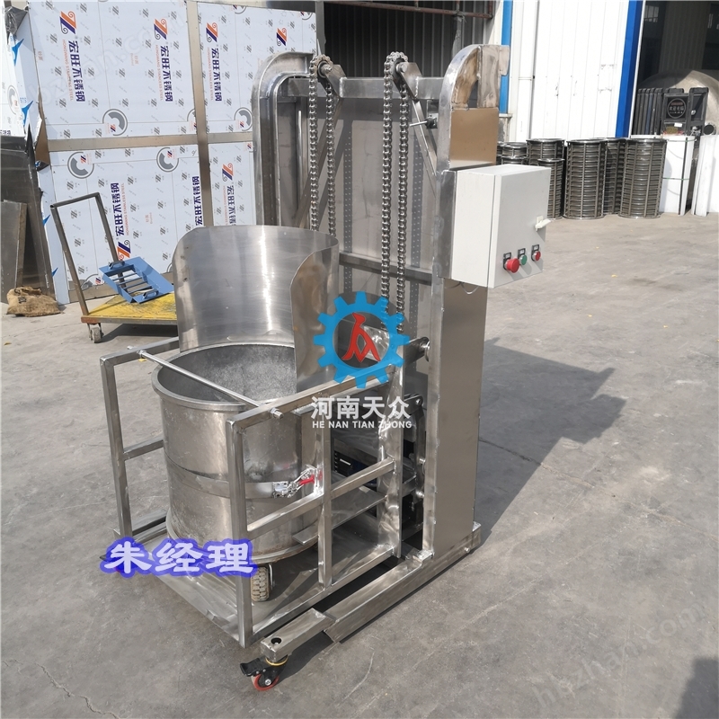 The device has a simple structure and is easy to operate. It is one of the supporting equipment for the pre-treatment system of kitchen waste treatment equipment. It is a supporting equipment for lifting the kitchen waste bin into the press machine of the kitchen waste treatment equipment. The elevator is designed reasonably and easy to operate, and is a set of equipment in the field of environmental sanitation and environmental protection.