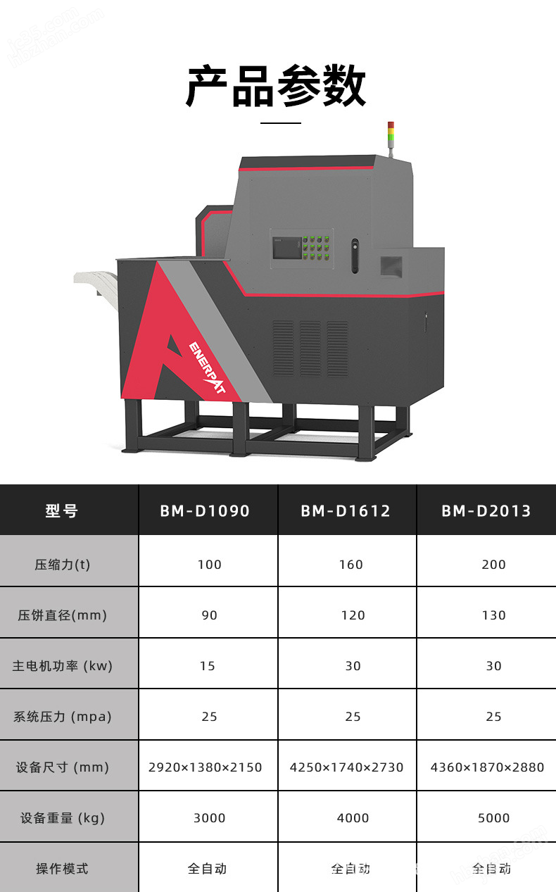 (1) Enpat metal chip press has a complete product line, ranging from 50 tons to 630 tons of pressure, with an hourly output of 50-4000 kilograms (taking iron chips as an example). Customers can choose the appropriate model according to their own needs.